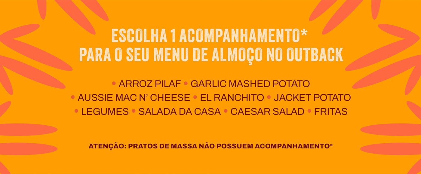 O Outback oferece opções deliciosas de acompanhamento para complementar seu almoço: Arroz Pilaf, Garlic Mashed Potato, Aussie Mac N’ Cheese, El Ranchito, Jacket Potato, Legumes, Salada da Casa, e Caesar Salad. Escolha o seu favorito e torne sua refeição ainda mais saborosa!
